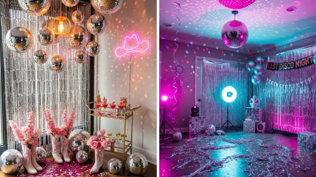 A western-meets-disco theme featuring cowboy boots, metallic fringe, mirror balls, and neon rodeo decor that blends country style with a dancefloor aesthetic.
