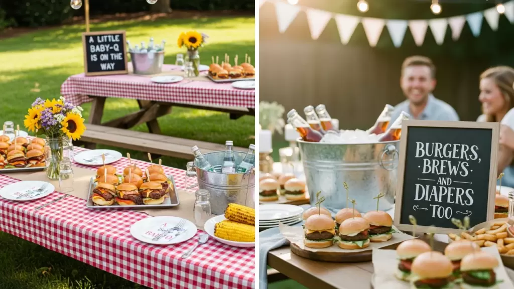 Host a casual backyard cookout baby shower with grill food and picnic tables. This setup uses classic BBQ decor for a relaxed celebration atmosphere. It is the perfect way to welcome a new baby with close friends.
