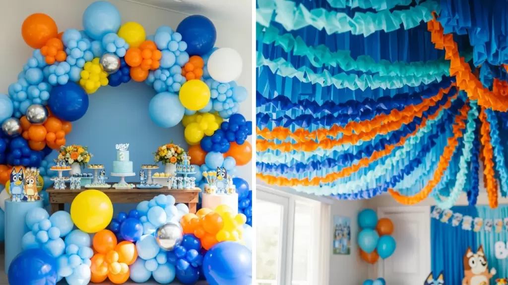 Design a festive balloon garland using Bluey’s main colors: blue, light blue, orange, yellow, and white. This decoration is perfect for placing behind the cake table or anchoring the party entrance.