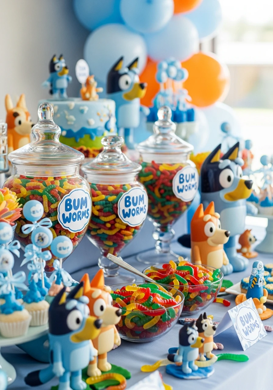 Keep the theme consistent by using plates, cups, napkins, and tablecloths featuring Bluey characters. Matching tableware makes cleanup easy and ties the food area into the overall decor.