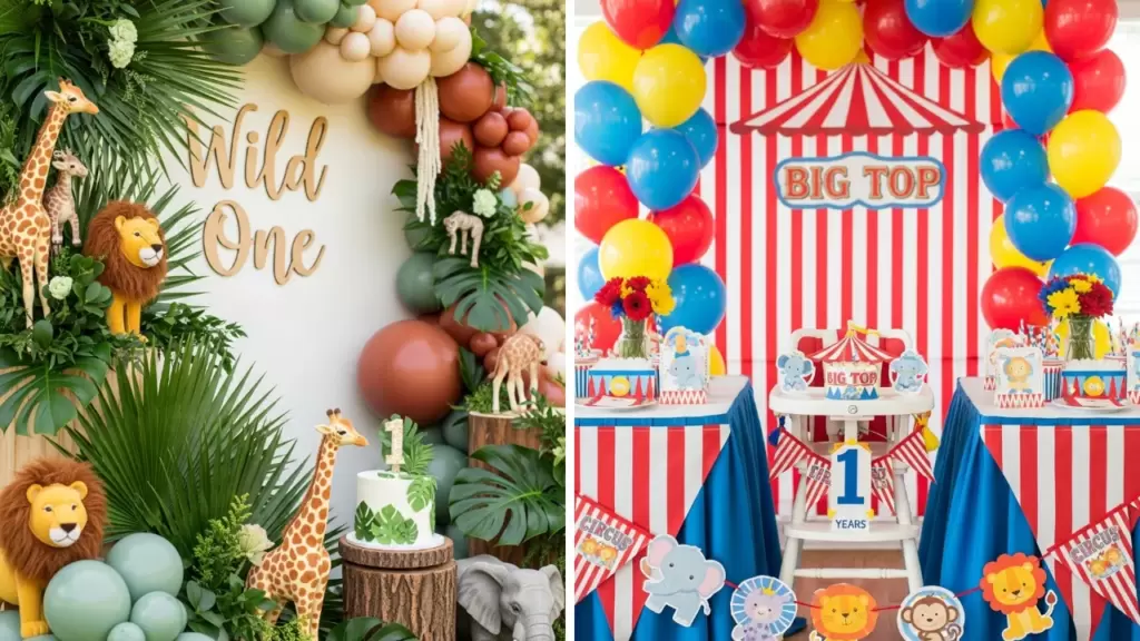 Create a jungle-inspired first birthday using animal decorations, greenery, and neutral earthy tones. Focus on safari animals, a “Wild One” sign, and a smash cake that matches the jungle theme.