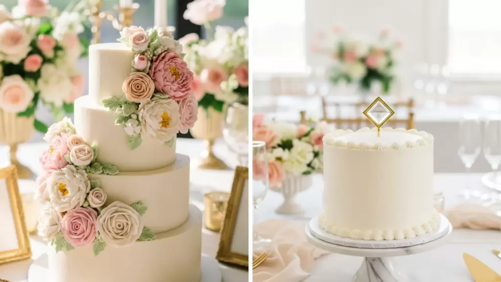 This pastel purple cake features lavender sprigs or lavender-colored flowers. It creates a soft and elegant centerpiece for a calm celebration. The light purple color is very trendy for bridal events.
