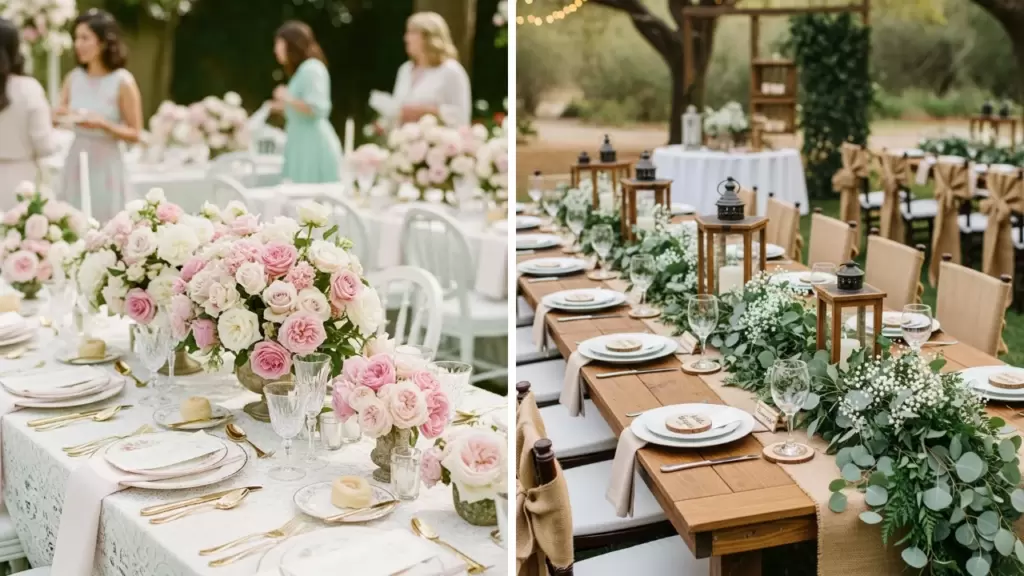 Use lots of roses, lace tablecloths, and soft pastel colors inspired by traditional English gardens. Focus on making the décor feel lush and slightly formal.