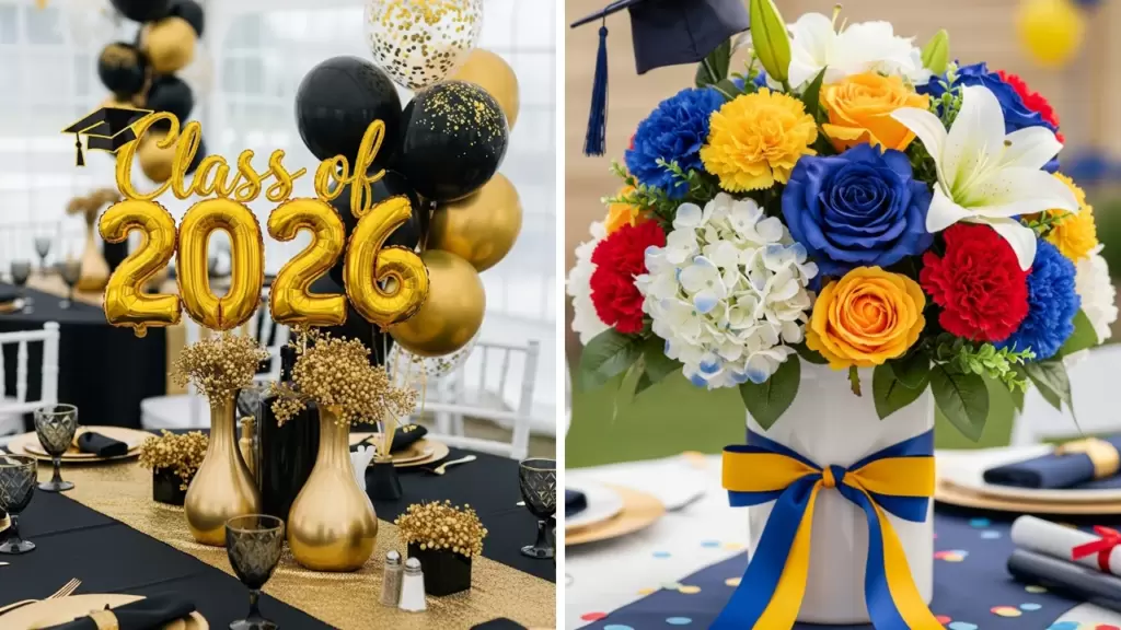 Create a classic graduation table centerpiece using black and gold. Use gold vases, black table runners, metallic balloons, and glitter accents for a bold and elegant look. Add a “Class of 2026” sign in gold foil.