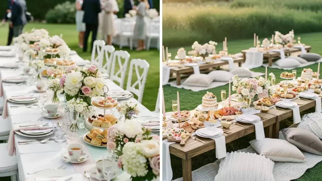 Set up outdoor tables with proper teacups, floral china, tiered dessert trays, and soft pastel décor. This is a lovely, traditional theme that feels very sophisticated outside.
