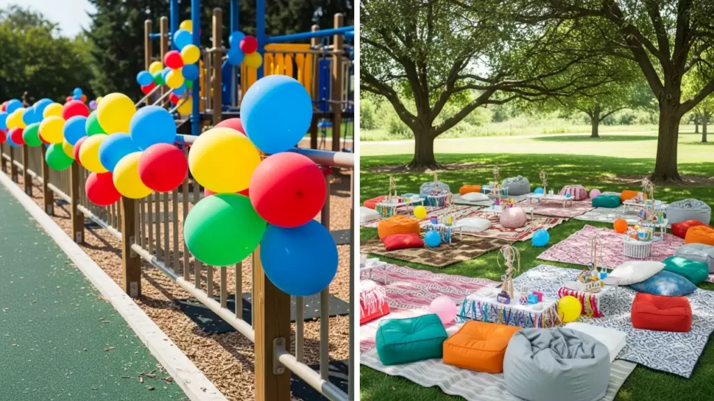 Attach bright balloon clusters to safe areas like railings or fences around the playground to create a festive atmosphere without blocking play zones.