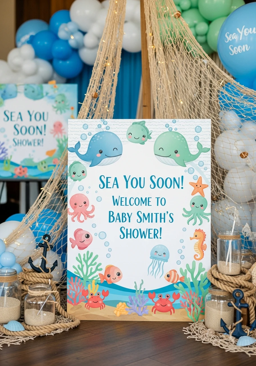 Greet guests with a charming welcome sign at your party’s entrance. Feature cute ocean graphics and the baby’s name, making everyone feel ready to celebrate the upcoming arrival.