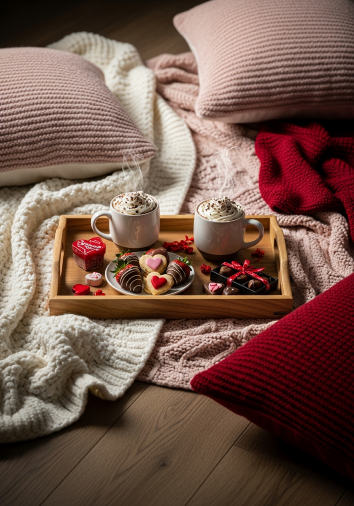 Set up a cozy viewing area with romantic comedies, popcorn, and candy. Use heart-themed bowls and dim lighting to enhance the experience.