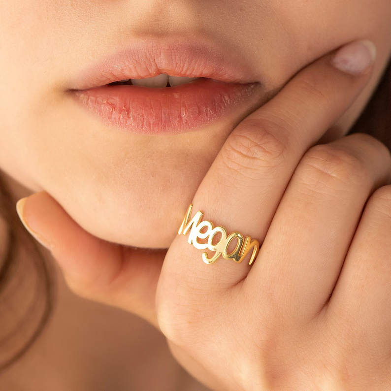 Personalize their jewelry collection with a sleek, gold-finished ring featuring their name or a special word. Its thin profile makes it ideal for wearing alongside other favorites.