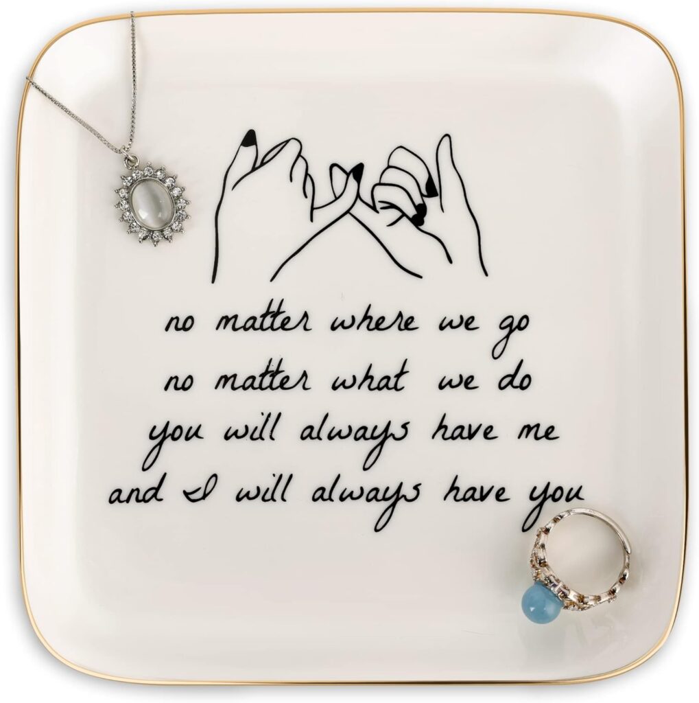 This ceramic dish is inscribed with a sweet message about friendship, making it a perfect parting gift. It’s a daily reminder of your bond every time they take off their rings.